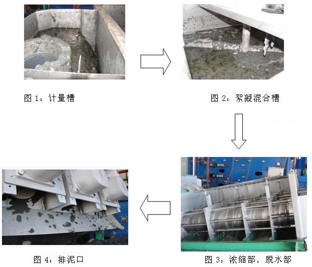 图3.巩花在浓缩部经过重力浓缩,大量的滤液从浓缩部的滤缝中排出,滤液送回原水池或调节池。浓缩后的污泥沿着螺旋轴旋转的方向继续向前推进,在背压板形成的内压作用下充分脱水。
